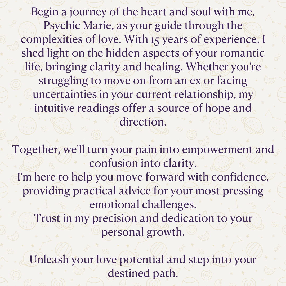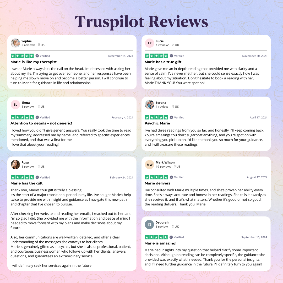 Marie has been incredibly accurate in all her readings, which is why I keep coming back for more. You can ask her anything, and she’ll give answers that bring clarity and guide you forward. Highly recommend!