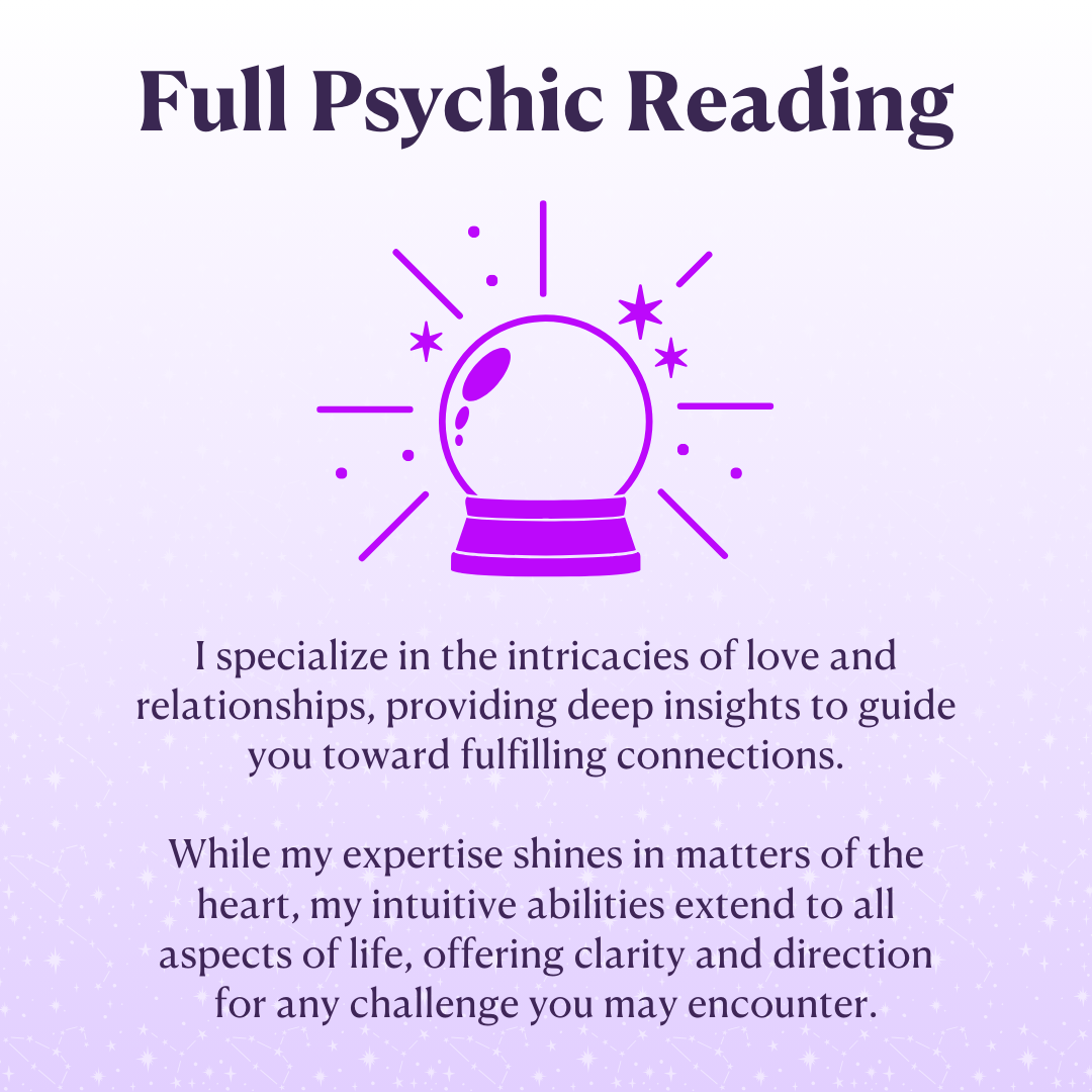 I specialize in providing tarot card readings and full psychic readings tailored to your unique needs and questions. My readings have transformed the lives of countless men and women, empowering them with the wisdom and insight needed to overcome obstacles, make informed decisions, and pursue their dreams.