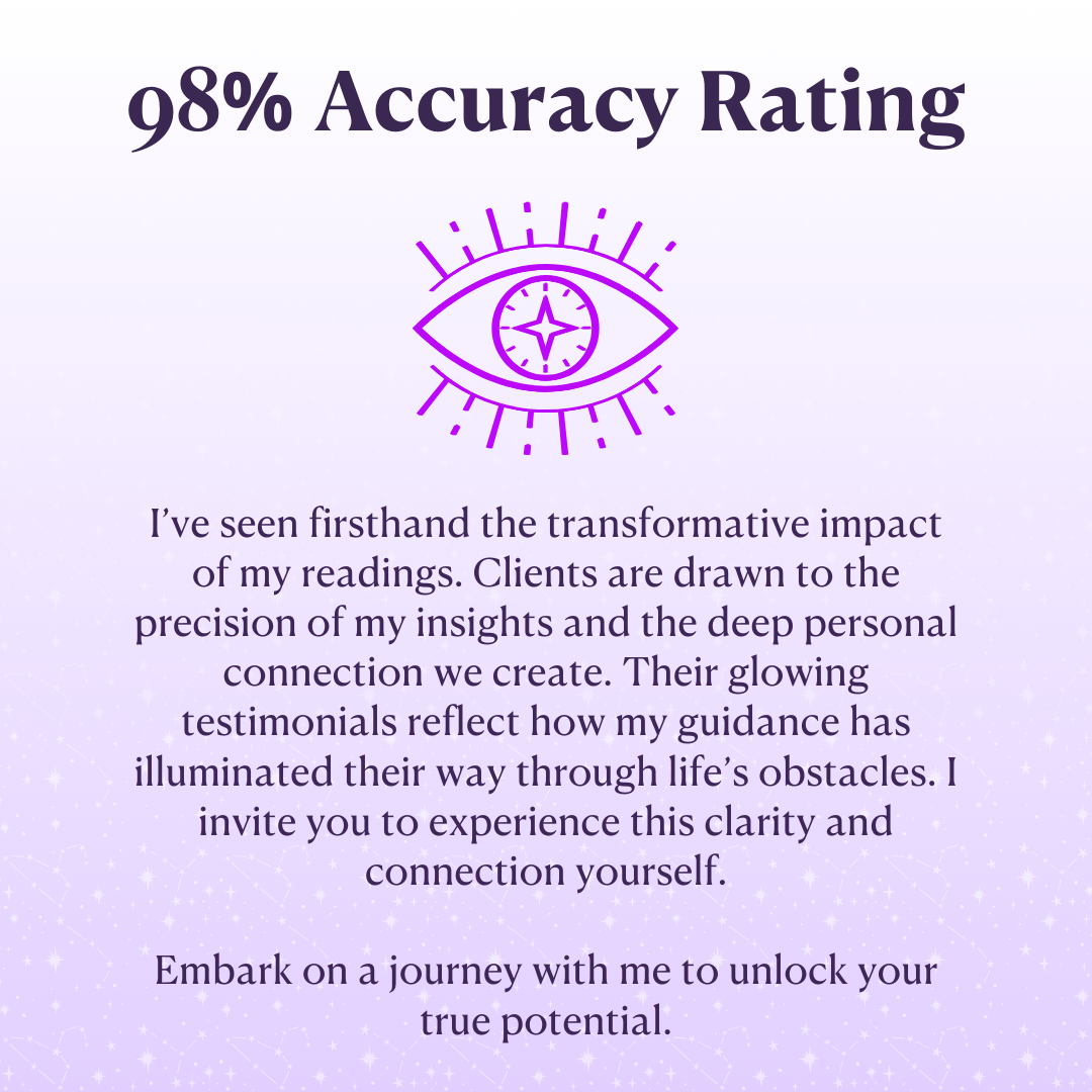 My readings have a 98% accuracy rate. They are highly detailed and insightful, offering valuable guidance. Keep in mind, the information I provide is designed to help you make informed decisions, unlock your potential, and improve your future.