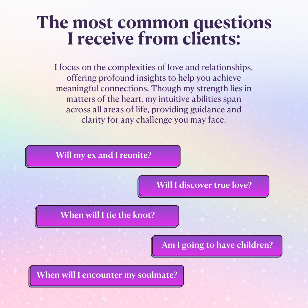 My highly acclaimed, comprehensive reading gives you the power to lead a more fulfilling life by allowing you to ask any 3 questions.